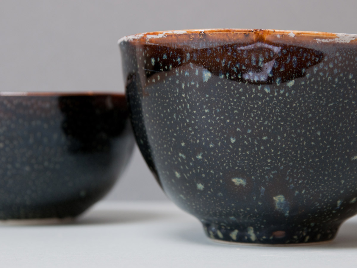 Nuit étoilée Vases en grès, émail à la cendre et ‘goutte d’huile’. Détails, vase émail à la cendre. Bols ‘nuit étoilée’, bleu de fer et gouttes d’huile. Série de trois bols ‘nuit étoilée’ Bol ‘nuit étoilée’, trilobé, 13 cm x 8 cm.