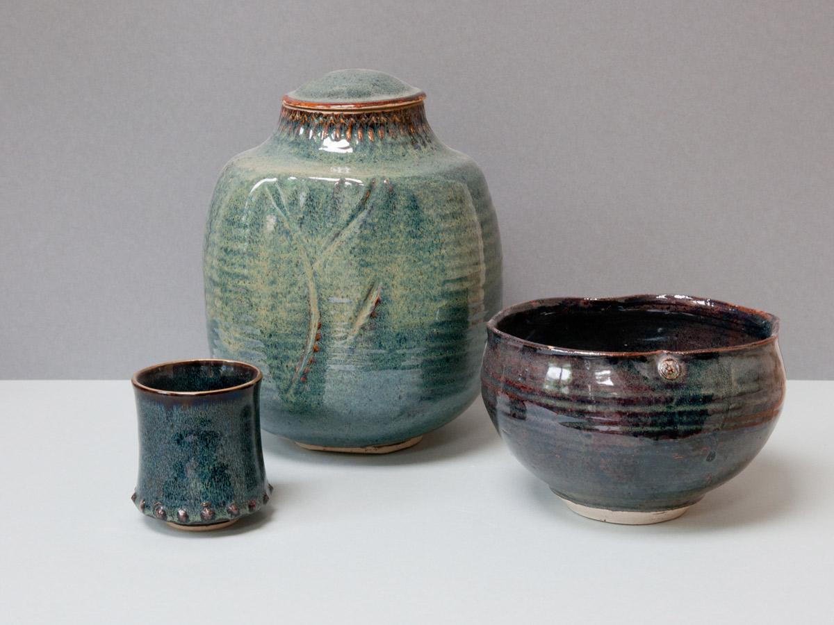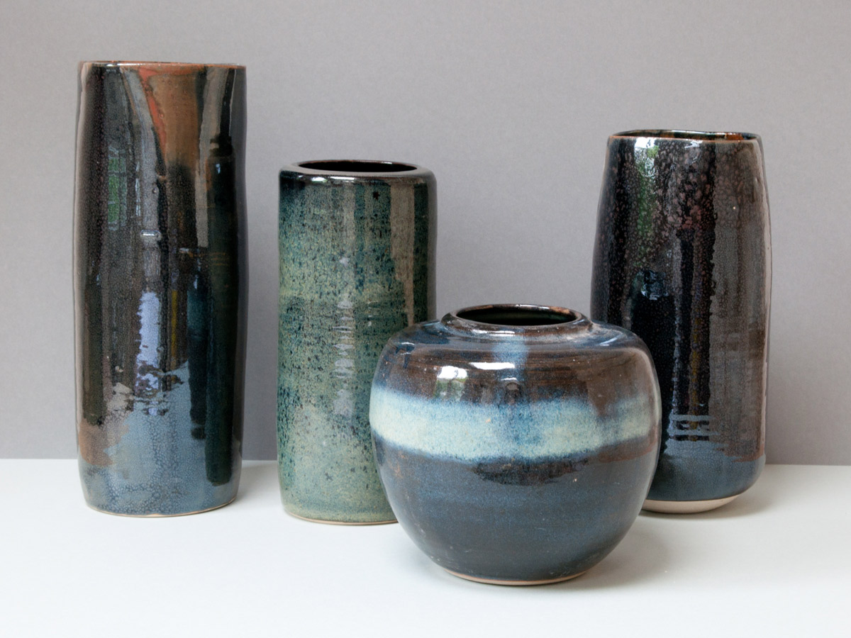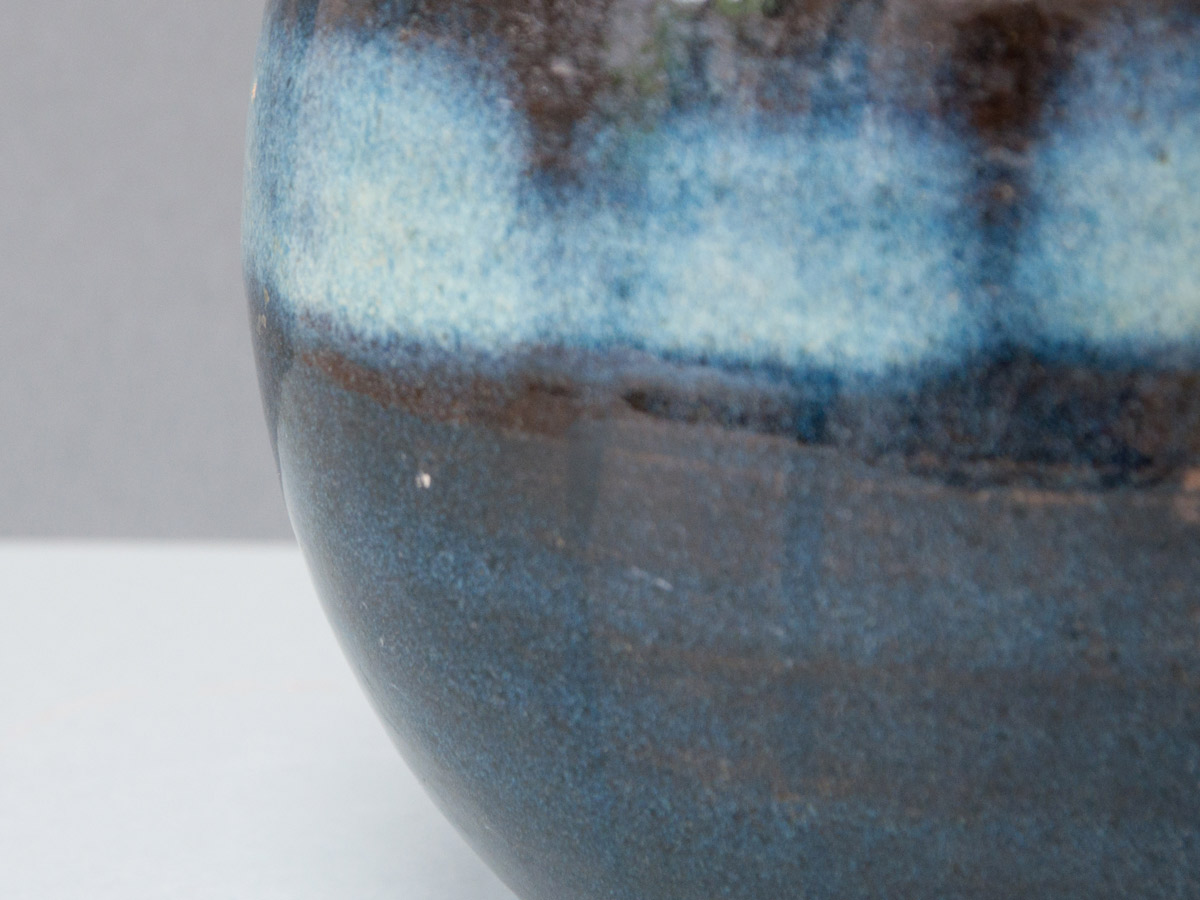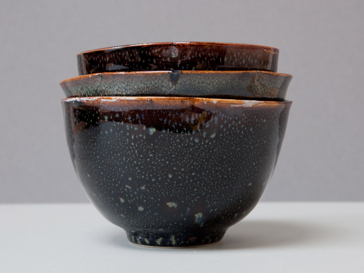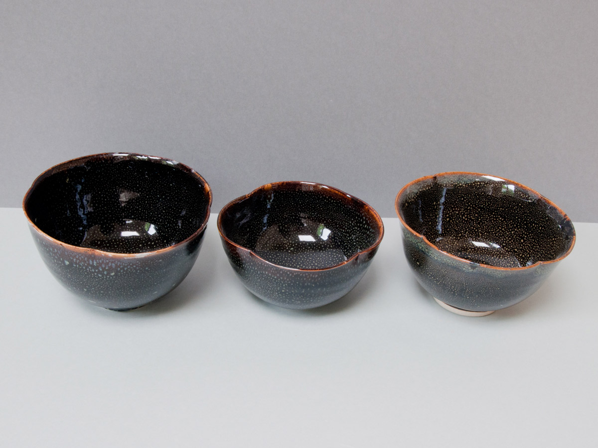 Nuit étoilée Vases en grès, émail à la cendre et ‘goutte d’huile’. Détails, vase émail à la cendre. Bols ‘nuit étoilée’, bleu de fer et gouttes d’huile. Série de trois bols ‘nuit étoilée’ Bol ‘nuit étoilée’, trilobé, 13 cm x 8 cm.